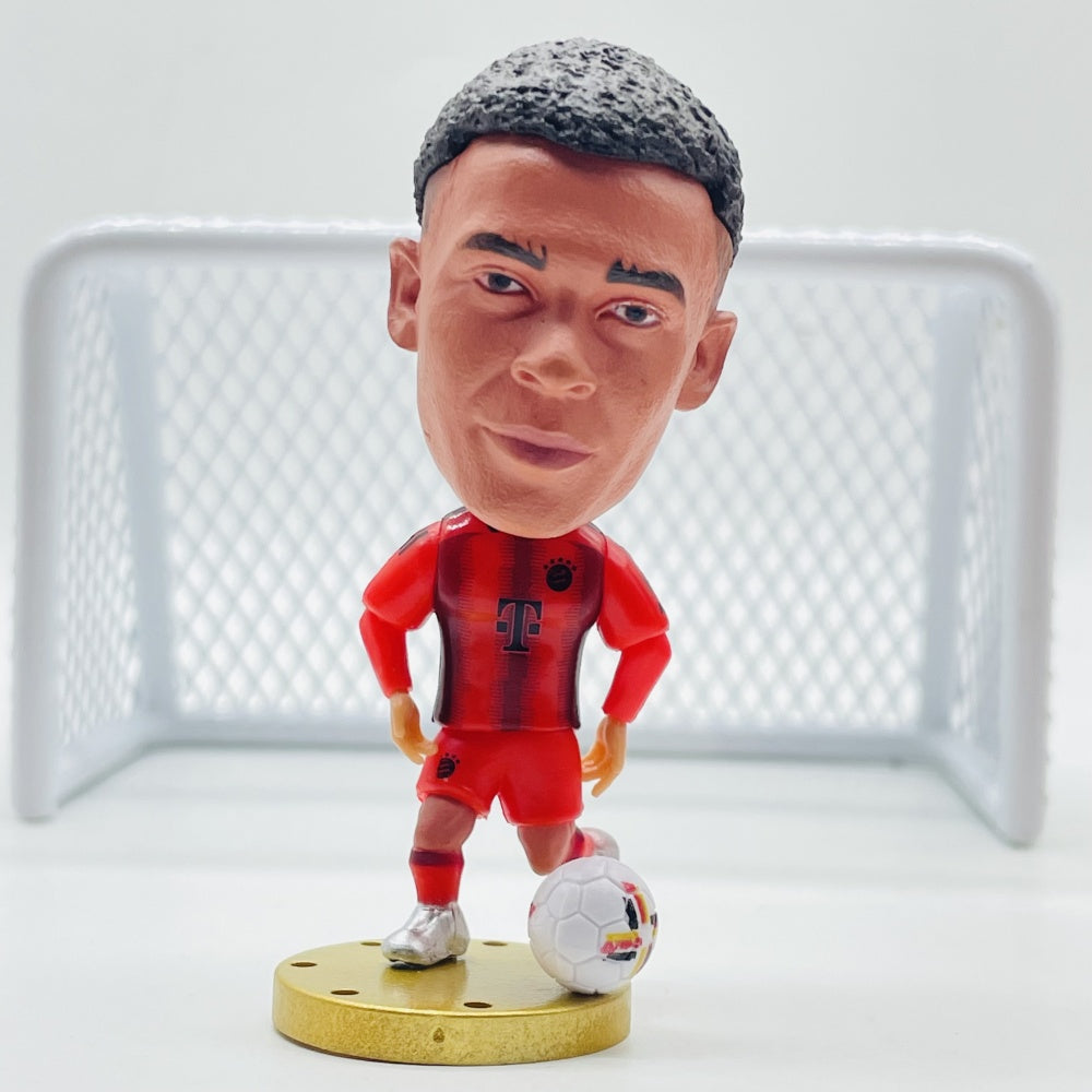Jamal Musiala to niemiecki ofensywny pomocnik, który w barwach Bayernu Monachium wyróżnia się niezwykłą techniką, szybkością i kreatywnością w ataku. Do klubu dołączył w młodym wieku i szybko stał się kluczową postacią ofensywy, imponując precyzyjnymi podaniami, efektownymi dryblingami oraz zdolnością do zdobywania bramek w decydujących momentach. Musiala wyróżnia się także inteligencją w grze, zdolnością do kreowania sytuacji bramkowych i współpracy z partnerami z zespołu, co czyni go jednym z najbardziej obiecujących talentów współczesnej Bundesligi. Figurka Jamala Musiali w barwach Bayernu Monachium to wyjątkowa propozycja dla fanów niemieckiego futbolu i kolekcjonerów, symbolizująca talent, dynamikę i przyszłość niemieckiej piłki.
