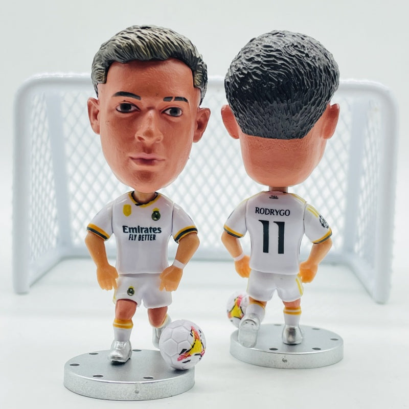 Rodrygo to brazylijski skrzydłowy, który od momentu dołączenia do Realu Madryt w 2019 roku wyróżnia się szybkością, techniką i skutecznością w ofensywie. Młody zawodnik szybko stał się ważnym ogniwem ataku „Królewskich”, imponując precyzyjnymi strzałami, efektownymi dryblingami oraz zdolnością do zdobywania bramek w kluczowych momentach. Rodrygo znany jest także z inteligencji w grze, umiejętności współpracy z partnerami z zespołu oraz kreatywności w kreowaniu sytuacji bramkowych. Figurka Rodrygo w barwach Realu Madryt to wyjątkowa propozycja dla fanów hiszpańskiego futbolu i kolekcjonerów, symbolizująca talent, dynamikę i obiecującą przyszłość brazylijskiego skrzydłowego w jednym z największych klubów świata.